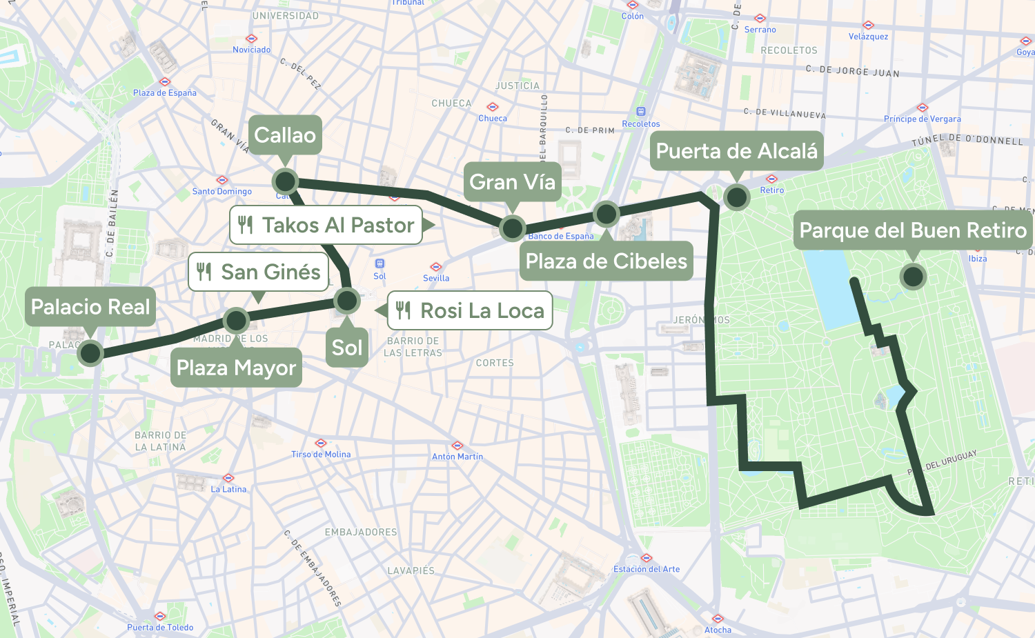 A perfect first-timer route that covers some of Madrid’s most iconic sights in one easy walk. It’s mostly flat and takes around 1.5-2 hours without stops.