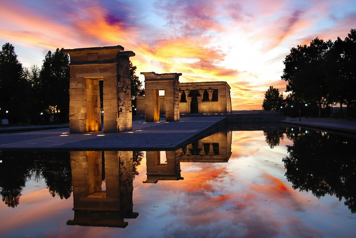 From Plaza de España, walk over to Templo de Debod for sunset (about 10–15 minutes). Arrive a little early to get a good spot to sit and enjoy the view