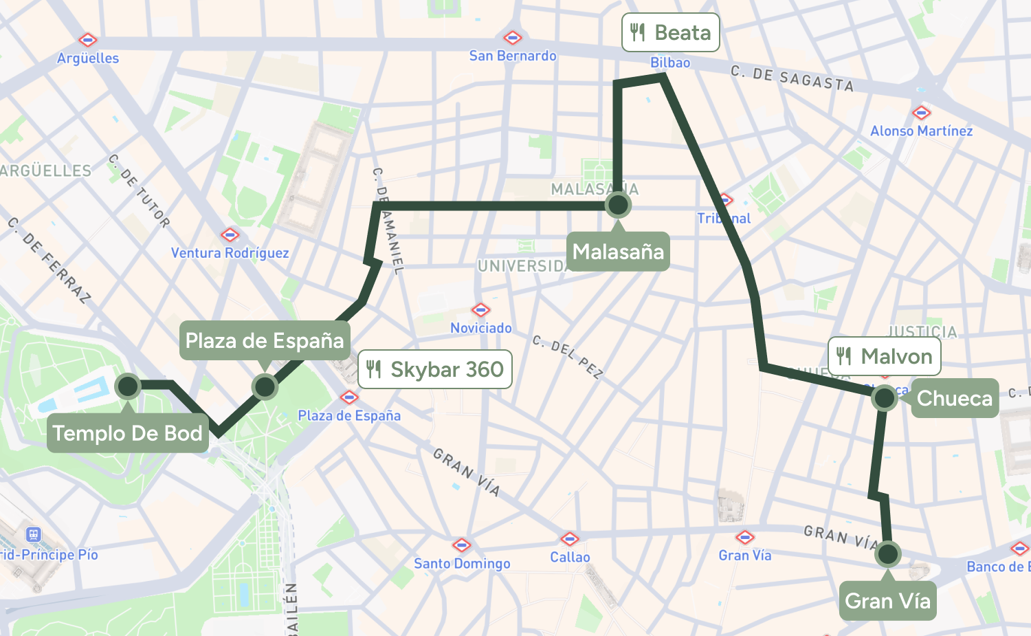 A fun neighbourhood walk for cafés, boutiques, street art and a more local Madrid feel, finishing at Templo de Debod for sunset. It’s an easy stroll and takes around 1–1.5 hours without stops.