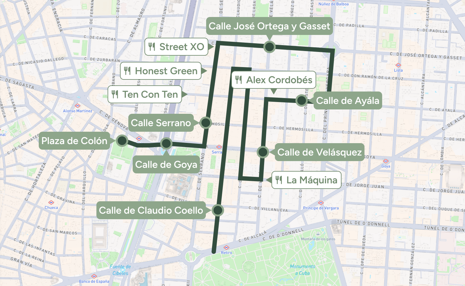 From Colón, walk along Calle de Goya (a main shopping street). Follow it until you reach Calle Serrano